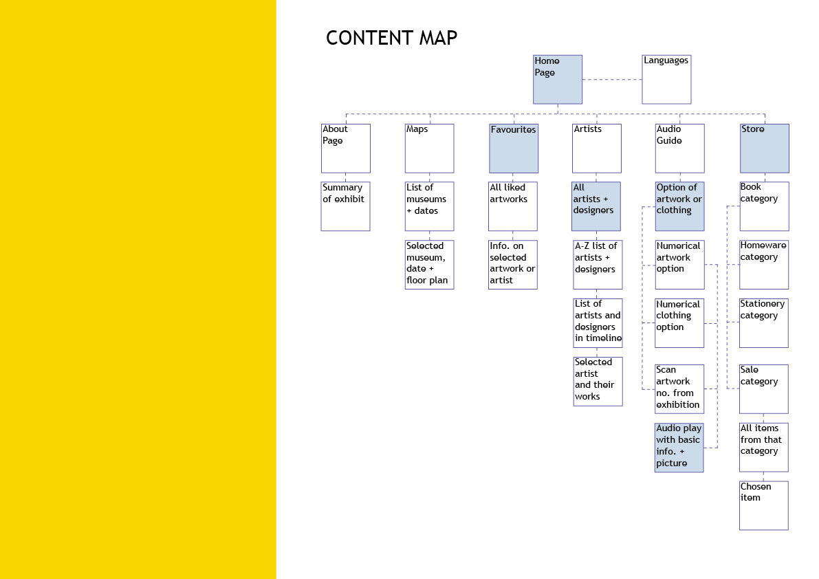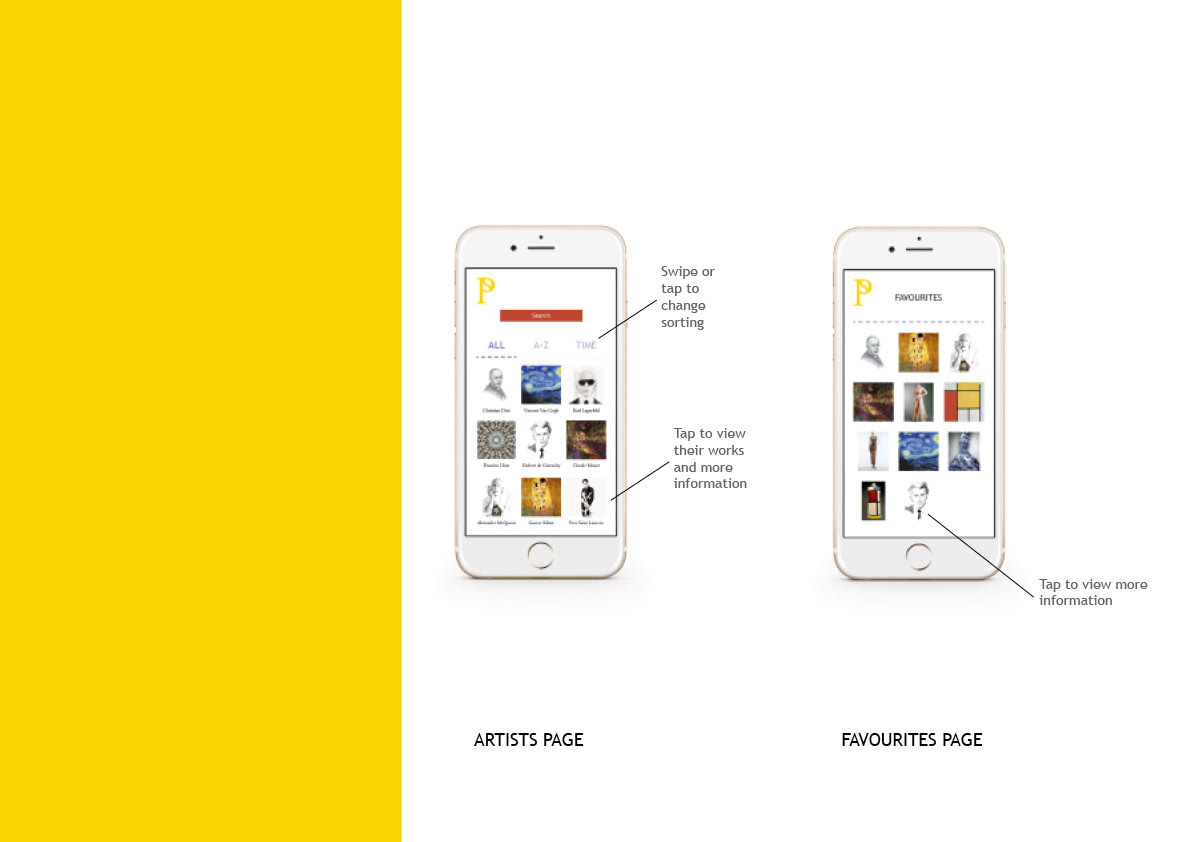 Assignment focusing on app design and brand development. The created brand is an art exhibition exploring art as fashion, showcasing famous artworks and fashion designs, looking at the inspiration of both mediums to creators.
